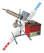 This Vacuum evaporator apparatus consists of an evaporating flask rotated by a heavy motor in a healing water bath. Vacuum distillation of solving at high and low temperature is achieved quickly and efficiently by use of a variable speed motor, which prevents foaming and bumping of the liquid (solvent) into the evaporating flask and also distillation under controlled atmosphere .The evaporating flasks is pear shaped to give a large surface area of evaporation and is clamped to a glass duct which goes through the drive unit and protrudes about 120 mm into the condenser. The condenser is fitted with standard joint at the bottom for receiver flask. With a quick action jack and WATER BATH Microprocessor based Digital controller. |