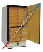 Made of double walled, inside & outside body made of thick stainless steel sheet with thick glass wool insulation. It has three compartments, each compartment having three compartments, each compartment having three independent glass doors making the total number of door nine. Each door seals perfectly by means of a rubber gasket to maintain humidity between 40% to 95% + 3% .Temperature is controlled from room temp. to 60°C + 1°C .The unit is provided with an air circulating blower & a concealed water tank to create humidity. Complete with dial thermometer, indicators and on/off switch. |